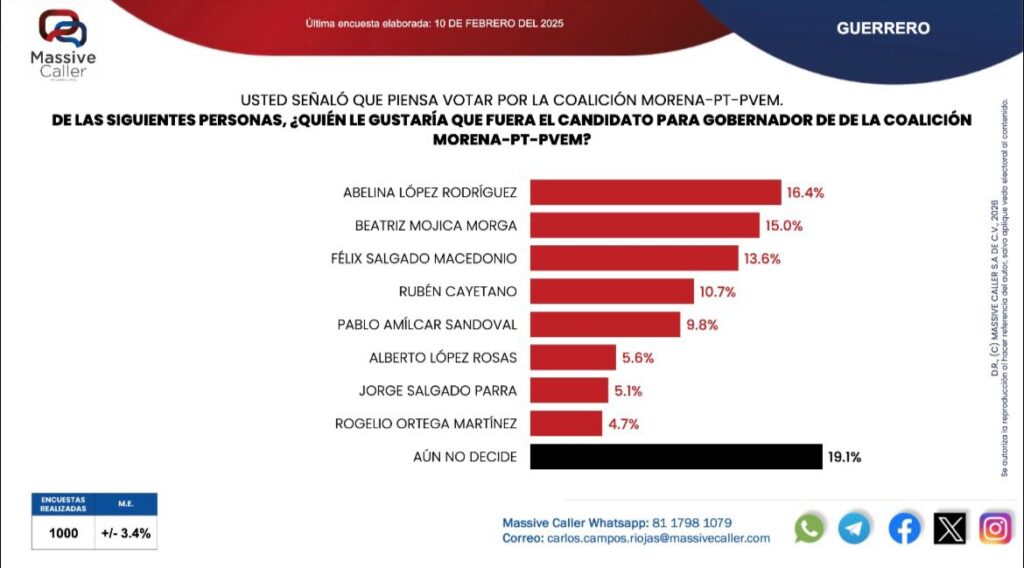 En el escenario interno de Morena-PT-PVEM, Abelina López lidera con 16.4% entre los simpatizantes de la coalición, seguida de Beatriz Mojica Morga con 15% y Félix Salgado Macedonio con 13.6%, mientras otros aspirantes registran porcentajes menores y un 19.1% aún no define su preferencia, lo que confirma su posición como la figura más reconocida y con mayor presencia dentro del bloque oficialista.