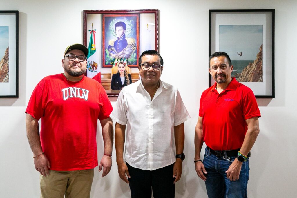 El secretario de Turismo de Guerrero, Simón Quiñones Orozco, junto a los organizadores Jesús Núñez y Héctor Cázares, afinaron los últimos detalles del espectáculo aéreo que reunirá a pilotos de talla mundial.