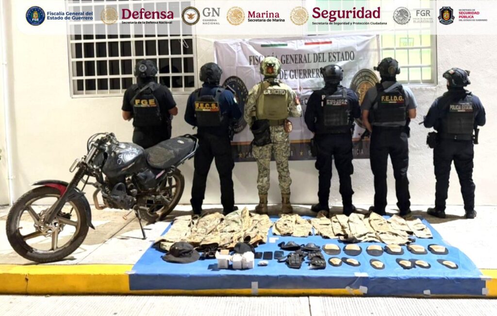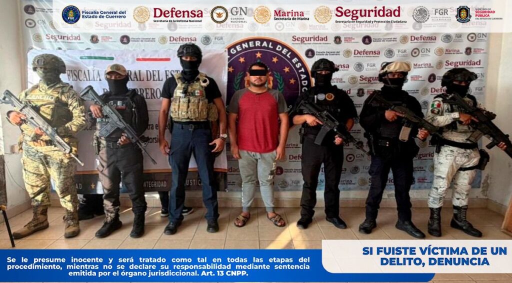 La Fiscalía General del Estado de Guerrero informa que personal de esta institución, en coordinación con la Secretaría de la Defensa Nacional (DEFENSA), Guardia Nacional (GN), Secretaría de Marina (SEMAR), Secretaría de Seguridad y Protección Ciudadana (SSPC) y Policía Estatal (SSPGro), realizó la detención en flagrancia de Miguel “N”, Víctor Hugo “N” y Elduin “N”, así como el aseguramiento de diversos indicios, en acciones distintas derivadas de recorridos de prevención del delito implementados por autoridades de los tres órdenes de gobierno en los municipios de Juan R. Escudero y Tecoanapa.