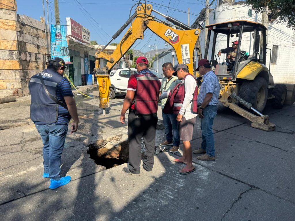 Personal de la Comisión de Agua Potable y Alcantarillado del Municipio de Acapulco (Capama) atiende una fuga en el colector de drenaje sanitario de 36 pulgadas ubicado sobre la calle Mal Paso, en la colonia Aguas Blancas, con medidas inmediatas para restablecer la funcionalidad de la red.