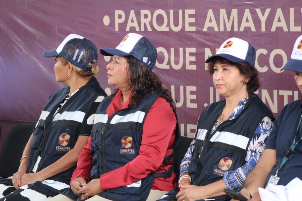 Durante la ceremonia, la secretaria general recibió de manos de María Inés Olea Radilla las placas de certificación de los parques Amayaltepec, Nuxco, Juventud, Adolfo López Mateos y Simón Bolívar, acreditados como espacios favorables para la salud según los estándares del Gobierno Federal.