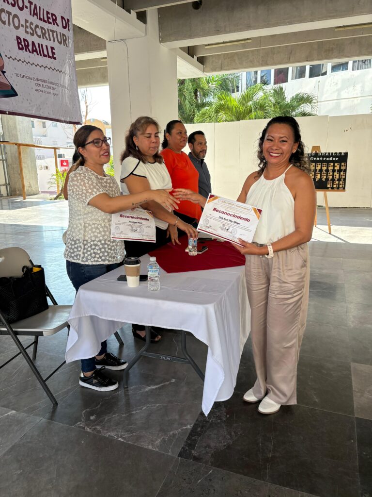En la explanada del Antiguo Ayuntamiento, la directora de la dependencia, Francia Cristina Ramírez Estrada, entregó reconocimientos a aproximadamente 80 personas que participaron en esta capacitación, en la que no sólo aprendieron sobre el sistema braille, sino que se les sensibilizó para apoyar a las personas con discapacidad visual en su vida cotidiana, respetando su independencia.