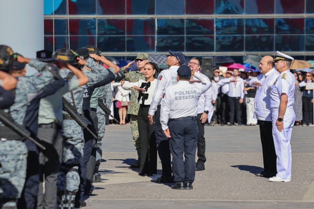 Al presidir la ceremonia cívica mensual de Izamiento de Bandera en la Casa del Pueblo, correspondiente al mes de enero, la mandataria estatal reconoció el trabajo de las Fuerzas Armadas, las corporaciones de seguridad y de quienes integran la Mesa de Seguridad en Guerrero, luego de estos resultados favorables para la paz en la entidad.