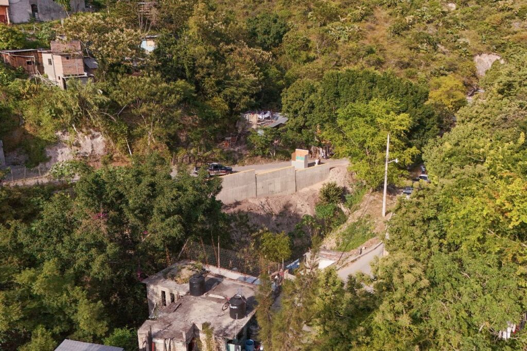 El muro, construido con concreto armado y acero de refuerzo, cuenta con 25 metros lineales y una altura de 7 metros, diseñado para detener el avance de los deslaves que cada temporada de lluvias amenazaban con cortar el paso y poner en riesgo las viviendas.