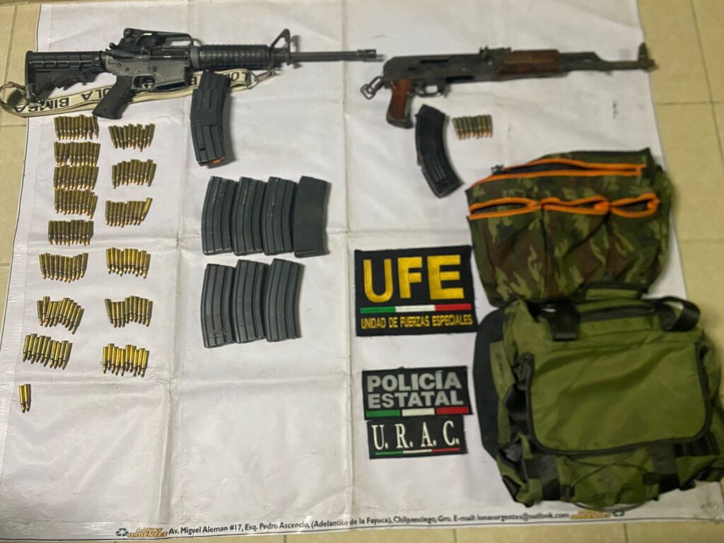 Entre lo asegurado se encuentran un arma larga tipo AR-15 calibre .223 con cargadores abastecidos, un arma AK-47 calibre 7.62×39, así como cargadores adicionales y cartuchos útiles.