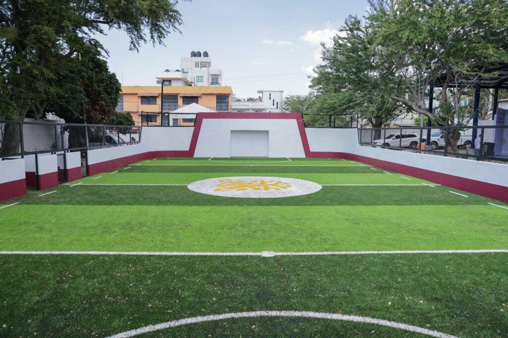 En este encuentro con la comunidad estudiantil, donde la mandataria realizó el penalti inaugural en la nueva cancha, se destacó que cuenta con pasto sintético, cimentación de zapatas corridas, muros perimetrales, piso de concreto y malla electrosoldada.