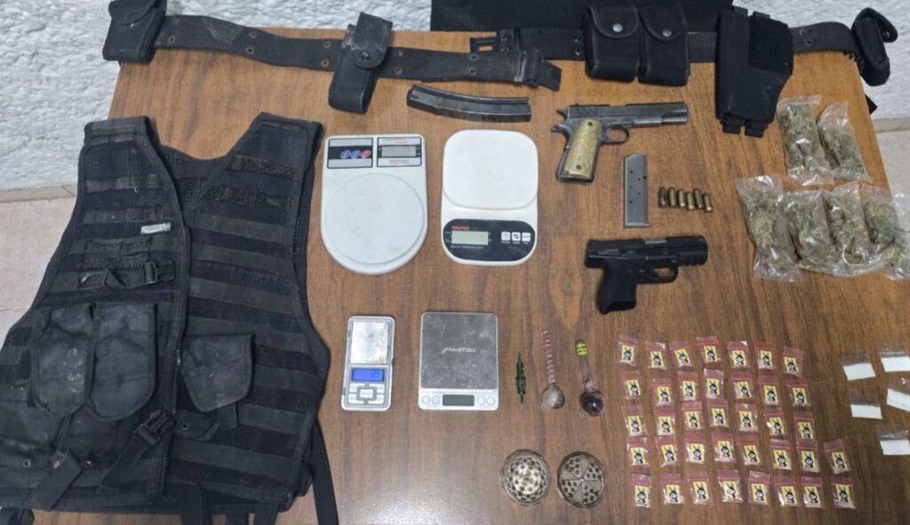Durante el cateo se aseguraron dos armas de fuego, marihuana, cristal, cocaína, un chaleco táctico, grameras y una motocicleta con reporte de robo.