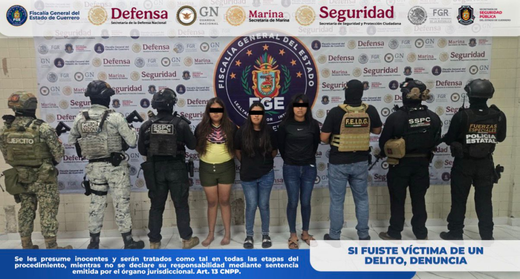 Como resultado de acciones operativas coordinadas, la Fiscalía General del Estado de Guerrero, en conjunto con DEFENSA, Guardia Nacional (GN), Secretaría de Seguridad y Protección Ciudadana (SSPC) y Policía Estatal (SSPGro), logró la detención en flagrancia de Karla “N”, Neidi “N” y Erika “N” en el municipio de Juan R. Escudero, Guerrero.