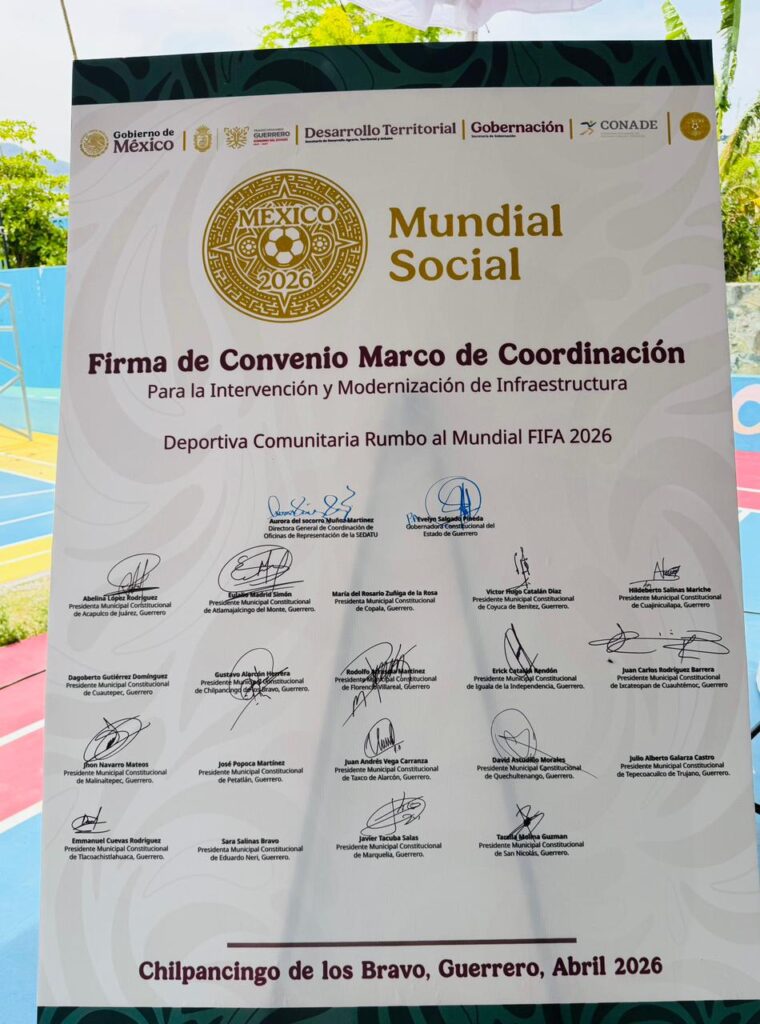 En este contexto, el alcalde participó en la firma del Convenio Marco de Coordinación para la Intervención de Infraestructura Deportiva Comunitaria junto a otros 17 presidentes municipales, en una estrategia conjunta impulsada por la presidenta de México, Claudia Sheinbaum Pardo, y la gobernadora de Guerrero, Evelyn Salgado Pineda.