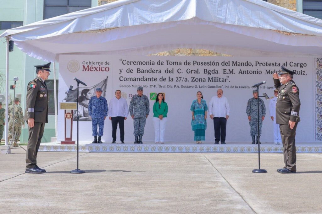 Acapulco, Gro., 18 de agosto de 2025.- Al asistir a la ceremonia de toma de posesión de Antonio Melchor Ruíz, como comandante de la 27 Zona Militar, la gobernadora Evelyn Salgado Pineda reconoció al Ejército Mexicano como una institución fundamental en la historia del país, que, con disciplina, lealtad, vocación de servicio y amor a la Patria, defiende la soberanía y que ha estado siempre presente en los momentos más decisivos para México y Guerrero.