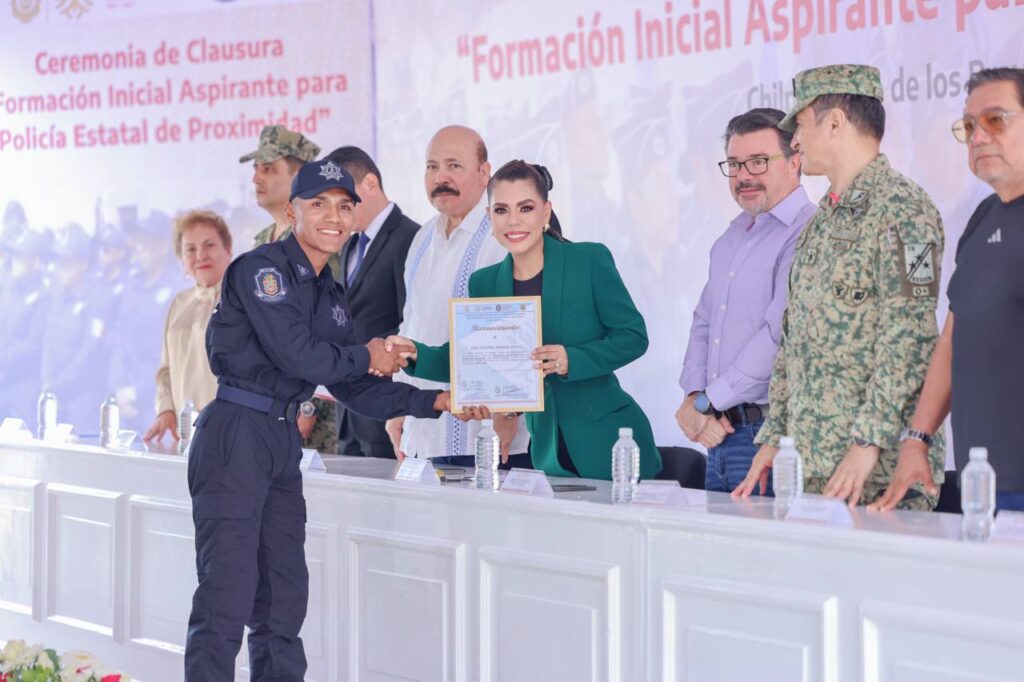 Chilpancingo, Gro., 10 de octubre de 2025. – La gobernadora Evelyn Salgado Pineda encabezó la ceremonia de graduación del primer escalón 2025 del Curso de Formación Inicial para Policía Estatal de Proximidad, donde 69 nuevos elementos, entre ellos 36 mujeres, culminaron su adiestramiento y capacitación especializada para incorporarse a los trabajos de paz, seguridad y atención ciudadana de la Secretaría de Seguridad Pública de Guerrero.