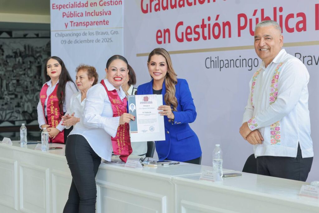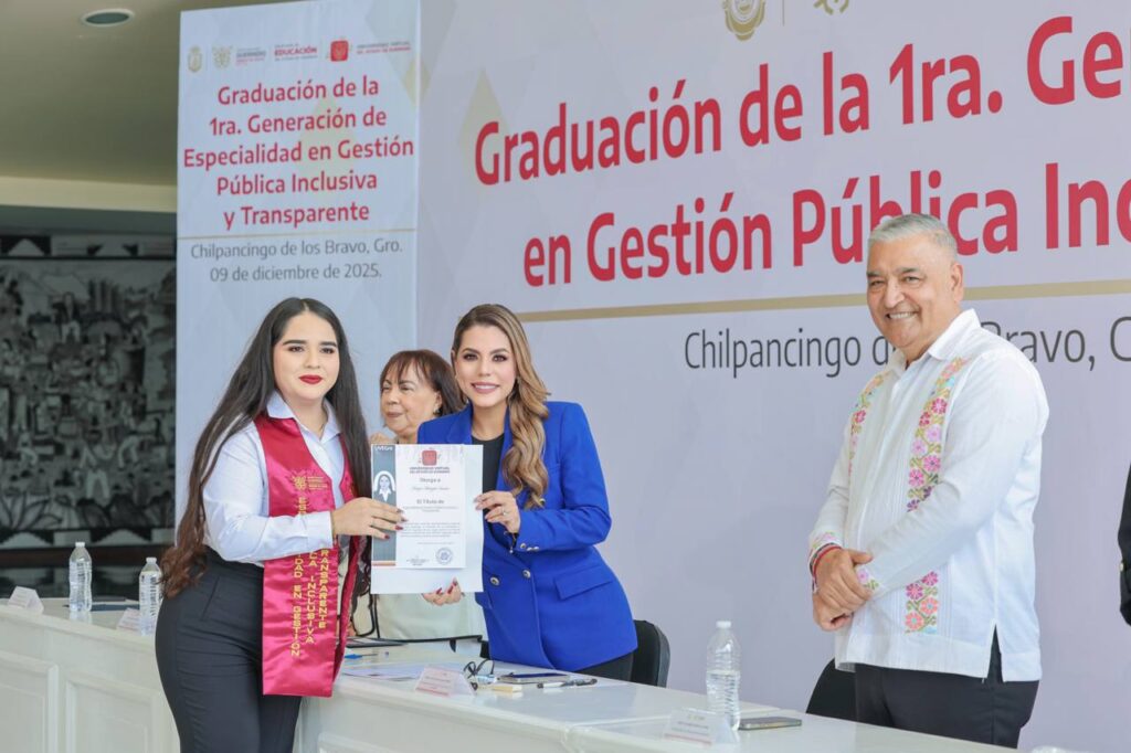 La mandataria estatal acompañó a las y los egresados, entre ellos el senador Félix Salgado Macedonio, quien también concluyó la Especialidad en Gestión Pública Inclusiva y Transparente, un programa diseñado para transformar la administración pública bajo los principios de honestidad, eficiencia y cercanía con el pueblo.