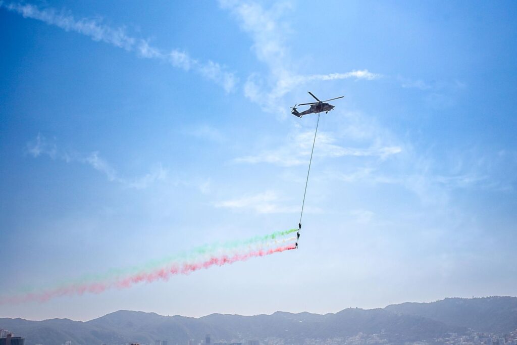 El espectáculo aéreo, a cargo de la Fuerza Aérea Mexicana, contó con más de 10 aeronaves, destacando la presencia de las Águilas Aztecas, que con sus maniobras captaron la atención de residentes y turistas.