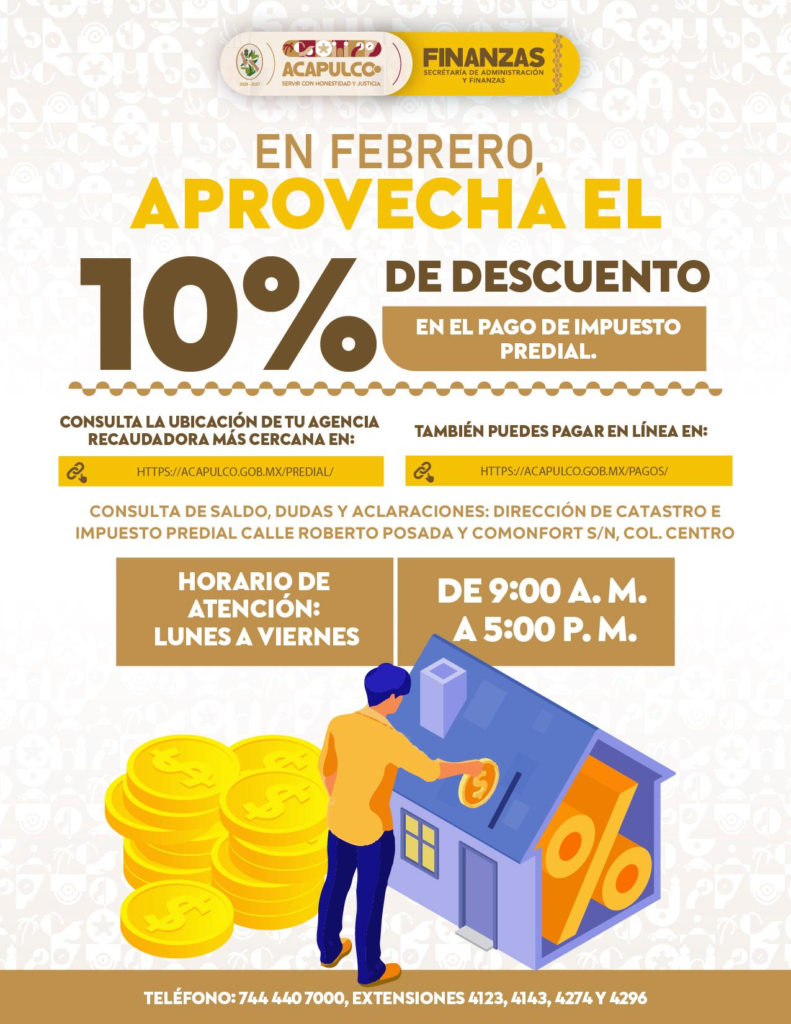 Para aliviar los gastos de los hogares y fortalecer la actividad comercial, el Gobierno de Acapulco, presidido por Abelina López Rodríguez, mantiene durante febrero un descuento del 10 por ciento en el impuesto predial y en las licencias de funcionamiento.