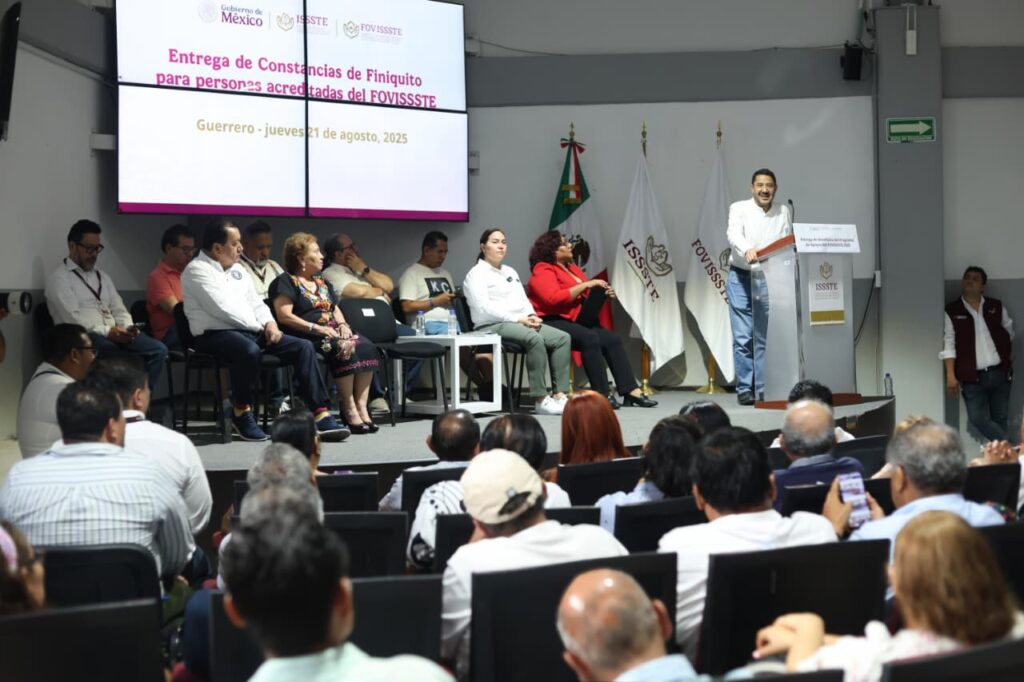 “Con la entrega de estas constancias se regresa al FOVISSSTE su naturaleza social para garantizar vivienda a la población. Lo reiteramos: En este gobierno estamos para transformar, no para administrar”, puntualizó Batres Guadarrama. Al evento asistieron la directora normativa del ISSSTE, Jabnely Maldonado Meza; el rector de la Universidad Autónoma de Guerrero, Javier Saldaña Almazán; autoridades estatales y federales; así como beneficiarias y beneficiarios del