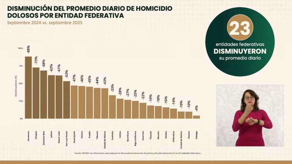 Chilpancingo, Gro., 7 de octubre de 2025. — Durante la conferencia matutina de la presidenta Claudia Sheinbaum, la titular del Secretariado Ejecutivo del Sistema Nacional de Seguridad Pública (Marcela Figueroa Franco) presentó las cifras oficiales correspondientes a septiembre de 2025, donde Guerrero alcanzó su menor número de homicidios dolosos en lo que va del año, con 90 casos y un promedio diario de 3 homicidios, lo que representa una reducción del 54% respecto a octubre de 2024.