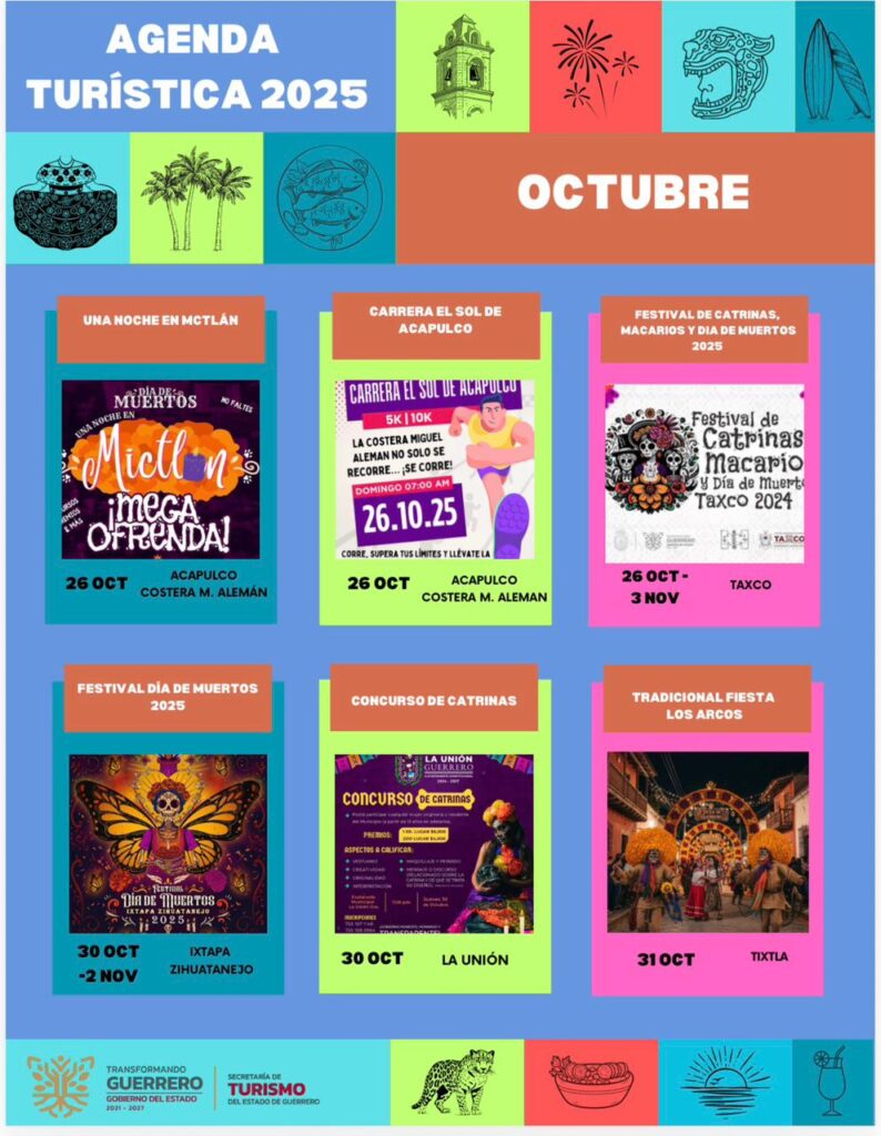 Con este panorama, el clima se convierte en un aliado para quienes deseen aprovechar la Agenda Turística de Octubre 2025, que ofrece una variada programación cultural y recreativa en todo el estado, desde el Festival de Catrinas y Día de Muertos en Taxco, hasta la Carrera El Sol y la Mega Ofrenda “Una Noche en Mictlán” en Acapulco, así como los festivales en Ixtapa-Zihuatanejo, Tixtla y La Unión.