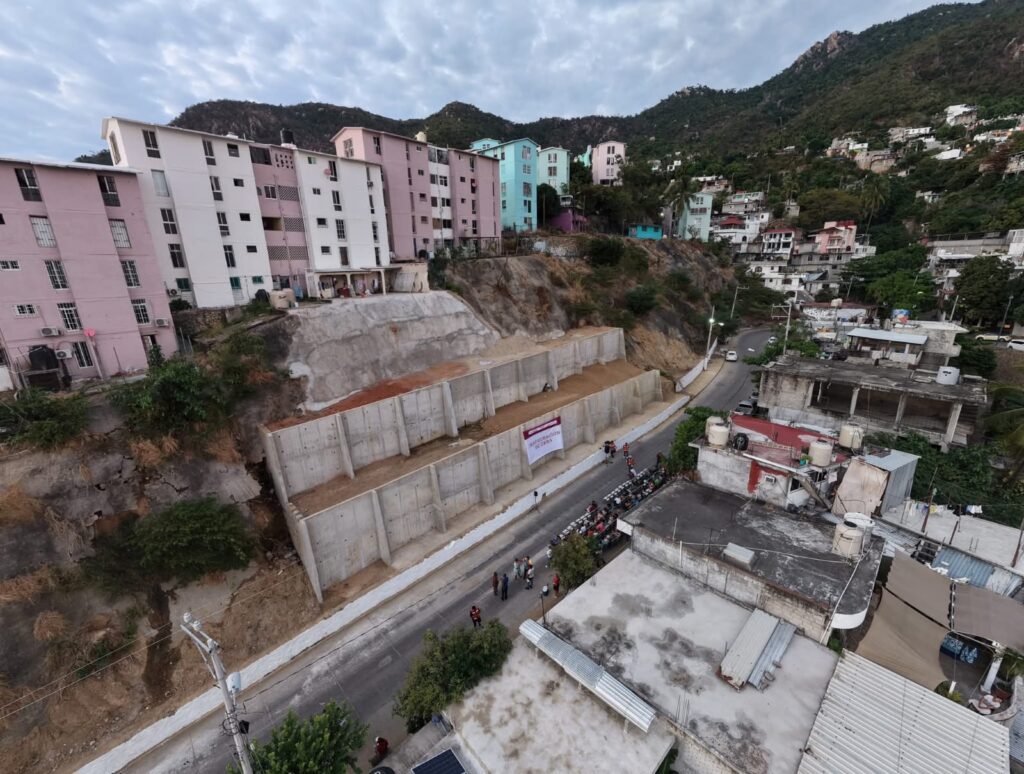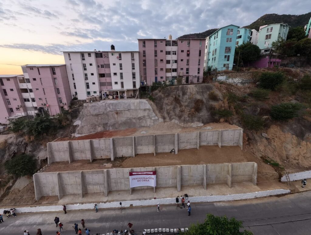 La intervención atiende una necesidad prioritaria de la colonia, donde los desgajes del antiguo talud, tras el impacto de los huracanes Otis y John, dañaron los cimientos de los edificios 26, 27 y 41 y generaron condiciones de vulnerabilidad tanto para quienes habitan en la parte alta como en la baja de la vialidad.