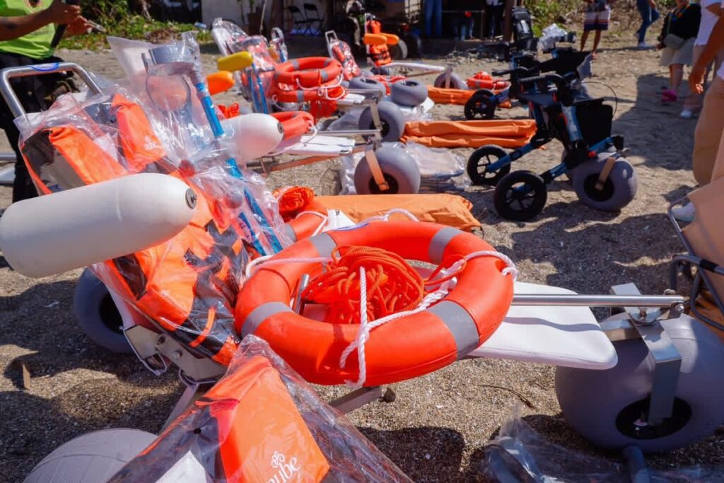 La remodelación de la Playa Incluyente contempló trabajos de mantenimiento general, adecuaciones estructurales y eléctricas, así como la instalación de infraestructura y equipamiento especializado, entre los que destacan señalética impresa y en sistema braille, camastros adaptados, sillas de ruedas oceánicas, andaderas para playa, muletas anfibias, camillas de rescate, aros salvavidas y chalecos salvavidas, entre otros implementos diseñados para facilitar el acceso y disfrute del entorno marino.