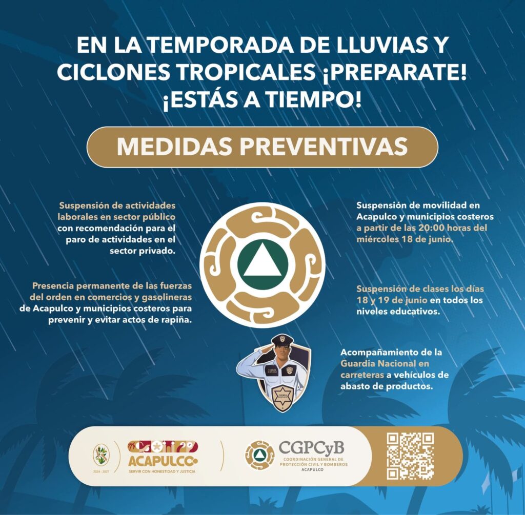 Acapulco, Gro., 18 de junio de 2025.- Ante el inminente impacto del huracán “Erick” en costas guerrerenses entre la noche de este miércoles y la madrugada del jueves, el Gobierno Municipal de Acapulco, encabezado por la Presidenta Abelina López Rodríguez, informa a la ciudadanía que se han tomado diversas medidas preventivas para salvaguardar la integridad de la población.