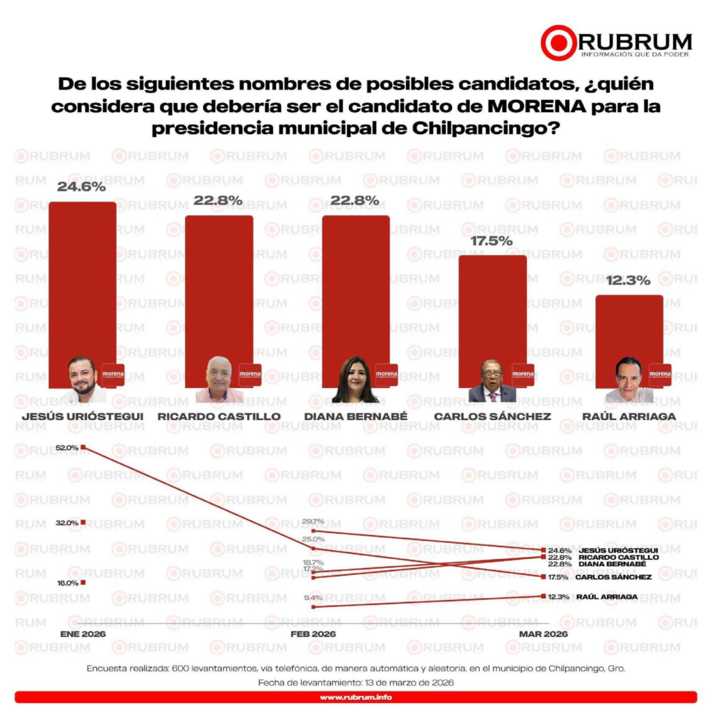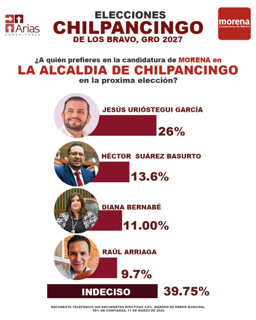 A poco más de un año de las elecciones de 2027, el panorama político en la capital guerrerense comienza a definirse. Según la más reciente encuesta de Arias Consultores, publicada el 11 de marzo, el actual diputado y presidente de la Junta de Coordinación Política (JUCOPO), Jesús Urióstegui García, se posiciona como el aspirante más sólido para encabezar la candidatura de Morena a la alcaldía de Chilpancingo.