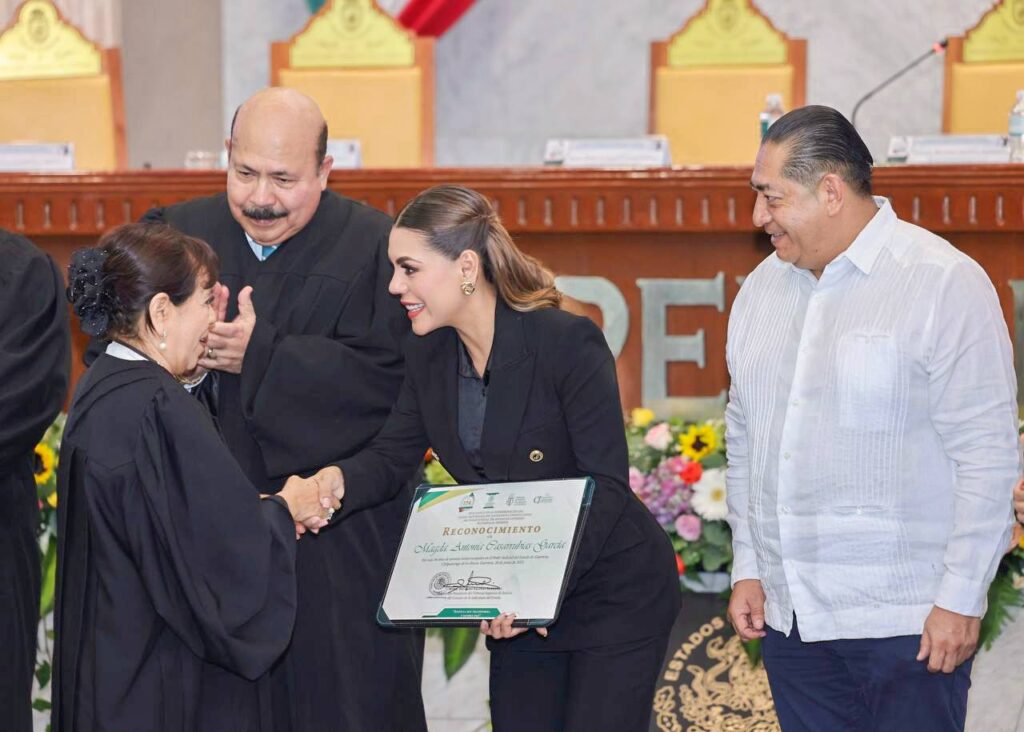 La gobernadora Evelyn Salgado y los titulares del Poder Judicial, Ricardo Salinas Sandoval, y del Poder Legislativo, Jesús Parra García, realizaron la entrega de reconocimientos al Mérito Judicial a magistradas, magistrados, juezas, jueces y personal jurisdiccional por más de 30 años de servicio a la justicia en Guerrero.