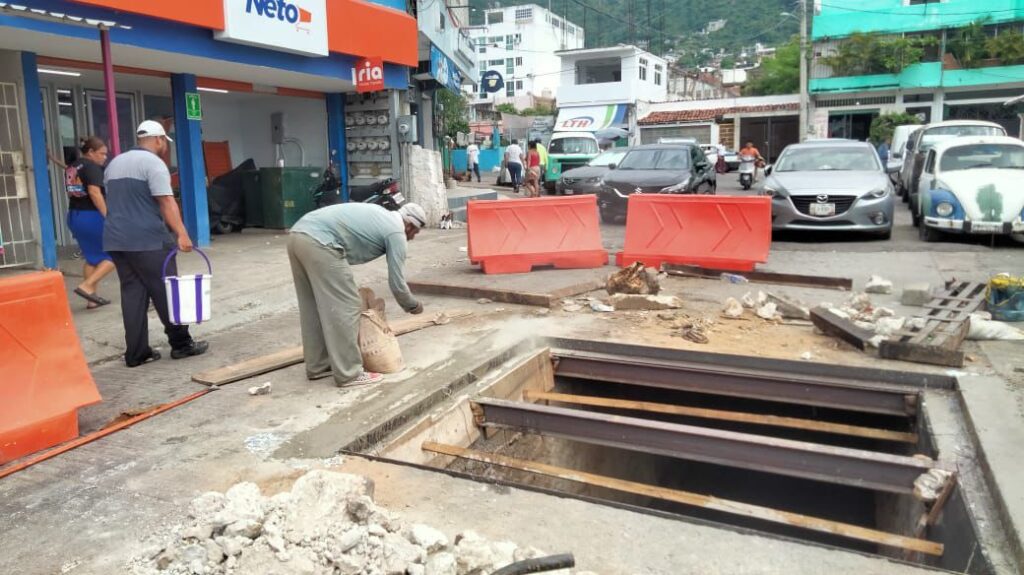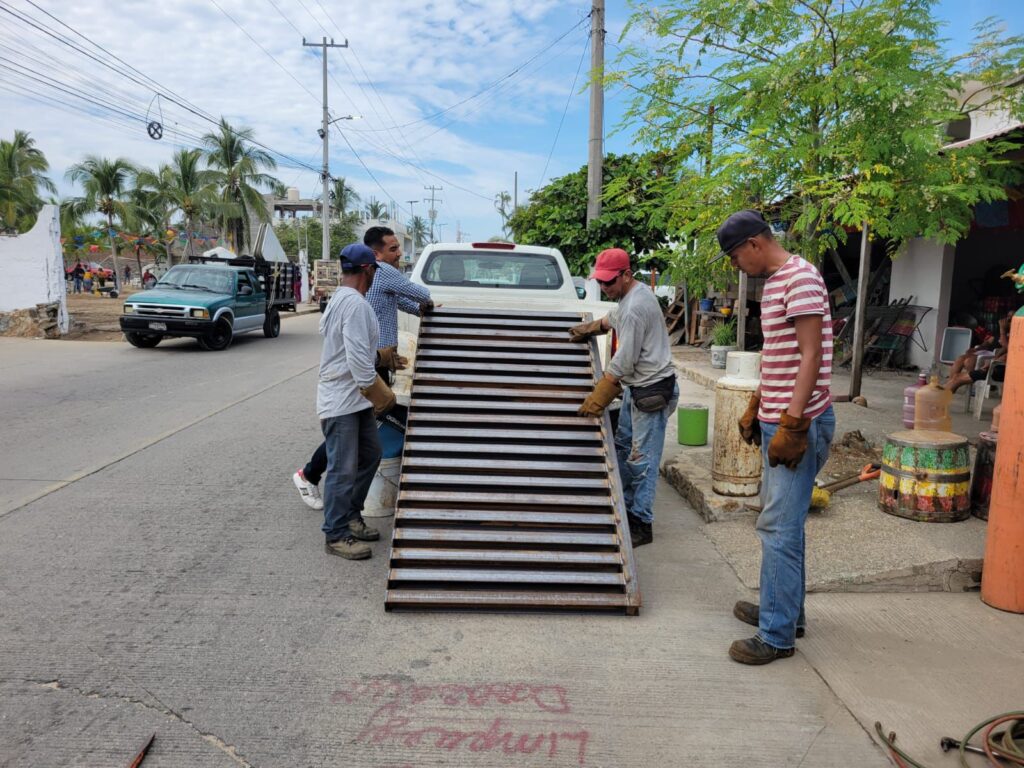 La semana pasada, la Dirección de Conservación y Mantenimiento rehabilitó y colocó tapas de rejillas pluviales en la colonia Navidad de Llano Largo, en la calle Acapulco casi esquina con la carretera Cayaco-Puerto Marqués. El personal operativo retiró escombro mediante carga manual en calle 9 esquina con calle 1, en la colonia Icacos, para garantizar el libre flujo del agua en la red pluvial.