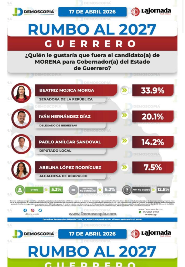 El contexto la favorece y Morena mantiene una hegemonía clara en Guerrero con 44.2% de intención de voto, muy por encima de sus competidores, lo que refuerza el posicionamiento de quien hoy encabeza sus preferencias internas.
