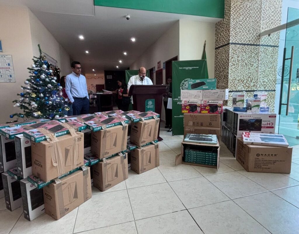 Chilpancingo, Gro 23 de noviembre de 2025.- El magistrado presidente del Tribunal Superior de Justicia del Estado de Guerrero, Mtro. Ricardo Salinas Sandoval, hizo entrega de equipo tecnológico a personal de órganos jurisdiccionales y áreas administrativas de Ciudad Judicial de Chilpancingo, con ello avanza con pasos firmes en su proceso de modernización tecnológica.