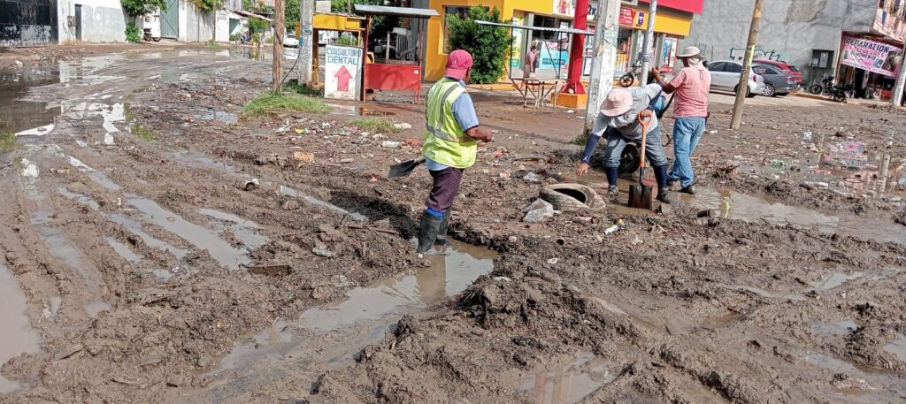 Acapulco, Gro., 21 de julio de 2025.- La Coordinación General de Servicios Públicos Municipales desplegó un operativo emergente de limpieza y desazolve en puntos críticos de la ciudad, luego de la tormenta eléctrica registrada la madrugada de este lunes, la cual generó arrastre de tierra, lodo, grava y residuos sólidos.