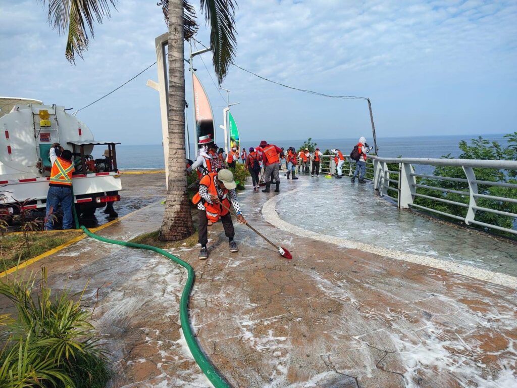Participaron Alumbrado Público, Imagen Urbana, Conservación y Mantenimiento, Mercados, Saneamiento Básico y Áreas Verdes, dependencias que integran la Coordinación de Servicios Públicos. Con el apoyo de pipas con agua y jabón, las brigadas procedieron al barrido de los escalones y la explanada del anfiteatro, mientras que otro grupo atendió la limpieza de playa La Angosta, comenzando por la recolección de residuos.
