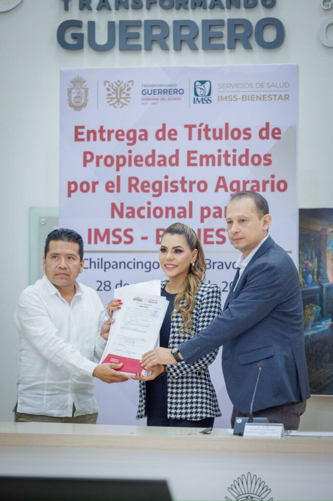 Chilpancingo, Gro. 28 de noviembre del 2024. – En la ruta de materializar la federalización de los servicios de salud, la gobernadora Evelyn Salgado Pineda entregó 32 títulos de propiedad expedidos por el Registro Agrario Nacional (RAN) a unidades médicas de IMSS Bienestar, con lo cual, Guerrero encabeza la lista de entidades con mayor número de documentos agrarios entregados y se posiciona dentro de los tres primeros lugares con mayores acciones realizadas en materia de salud en México.