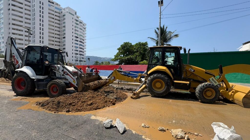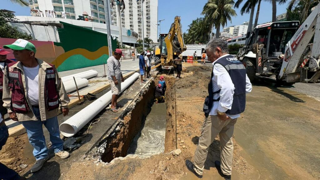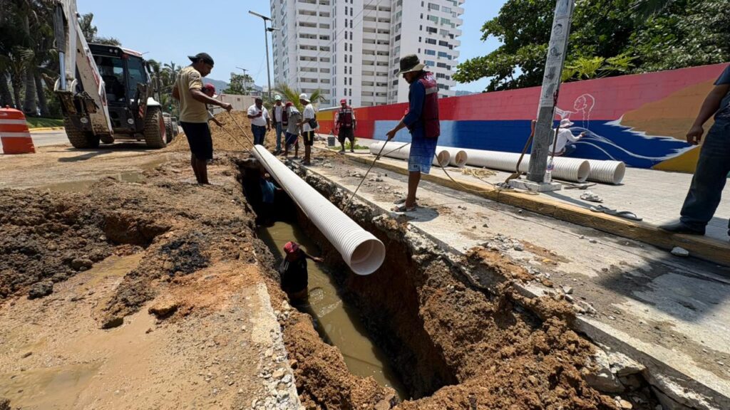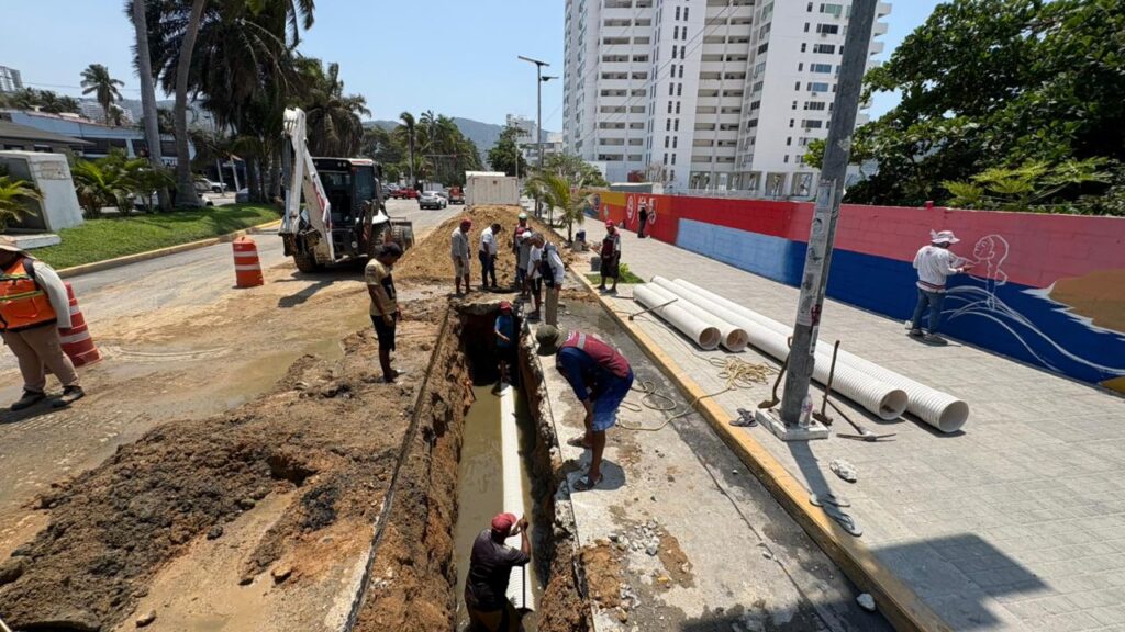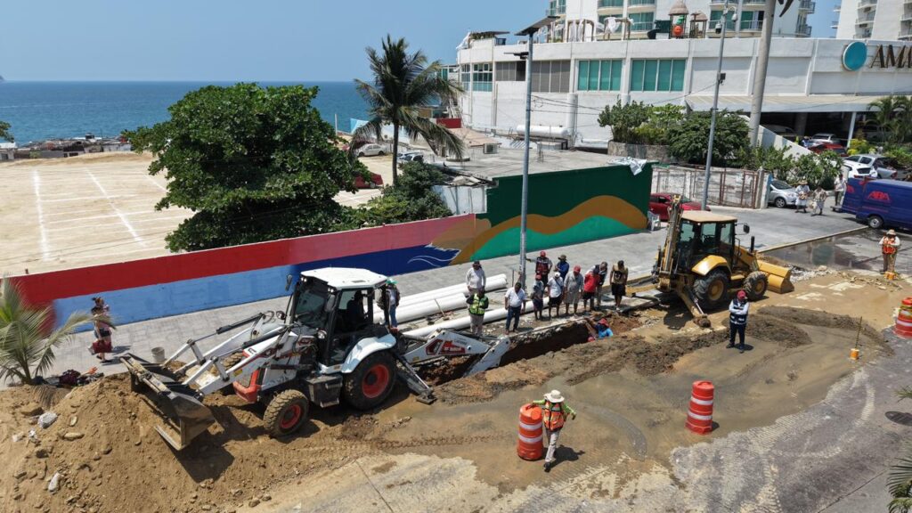 Personal de la Comisión de Agua Potable y Alcantarillado del Municipio de Acapulco (Capama) avanza en la sustitución de tramos de tubería sanitaria sobre la avenida Costera Miguel Alemán, con el fin de optimizar el flujo del sistema de drenaje y proteger la calidad ambiental de la bahía.