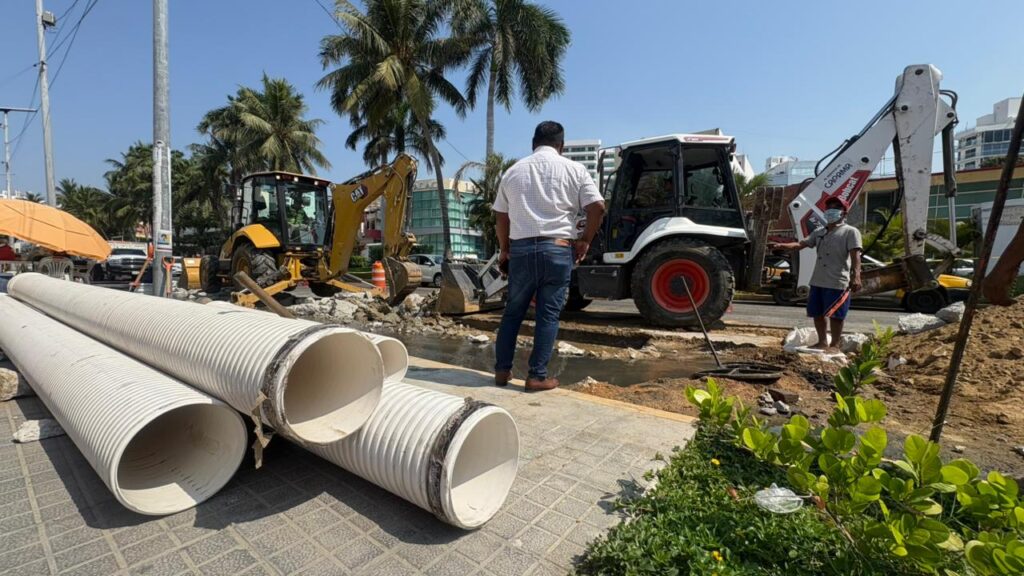 Este miércoles, en coordinación con Fonatur, los equipos operativos del organismo reemplazan tubería dañada a la altura del hotel Amares, en el fraccionamiento Club Deportivo. Estas intervenciones responden a fallas detectadas en el sistema de drenaje, que podrían generar escurrimientos hacia las playas y afectar la zona turística.